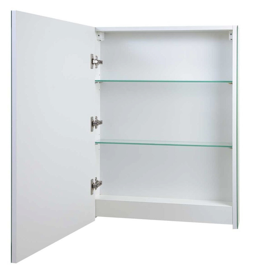 Зеркальный шкаф со светодиодной подсветкой. Корпус выполнен из ЛДСП. Боковые части корпуса зеркальные. Петли с доводчиками с правой стороны. Внутри шкафа две стеклянные полочки. Поставляется в собраном виде.