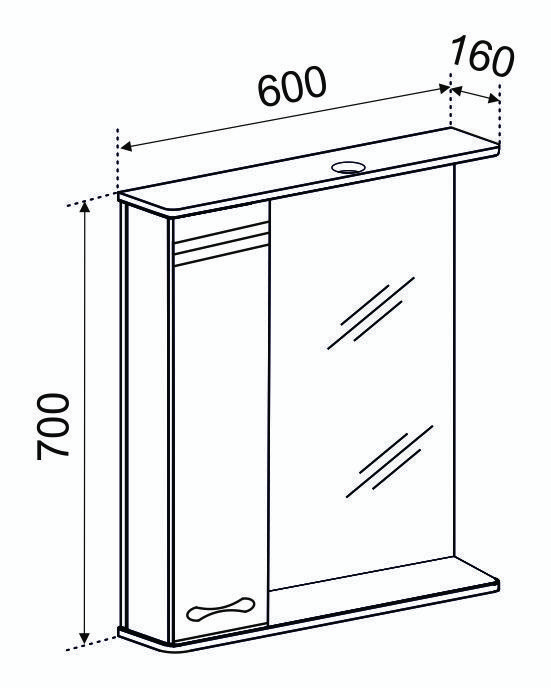 Один светитильник с блоком розетка/выключатель. Корпус выполнен из белого ЛДСП, фасад МДФ с пленкой ПВХ. Петли с доводчиками. На фасаде горизонтальная фрезировка. Внутри шкафа две стеклянные полочки.