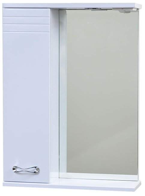 Один светитильник с блоком розетка/выключатель. Корпус выполнен из белого ЛДСП, фасад МДФ с пленкой ПВХ. Петли с доводчиками. На фасаде горизонтальная фрезировка. Внутри шкафа две стеклянные полочки.