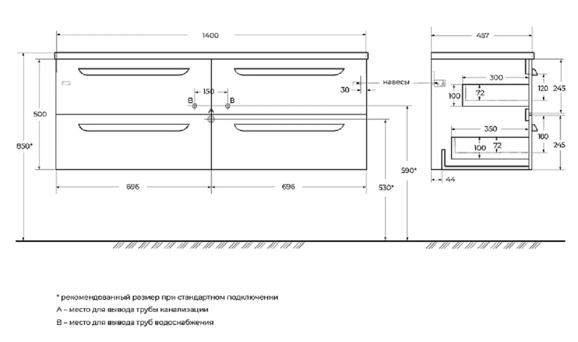 Тумба под раковину Cezares Eco-Cer-N-1400-4C-SO-2-BL, 140 см, подвесная, Bianco Lucido