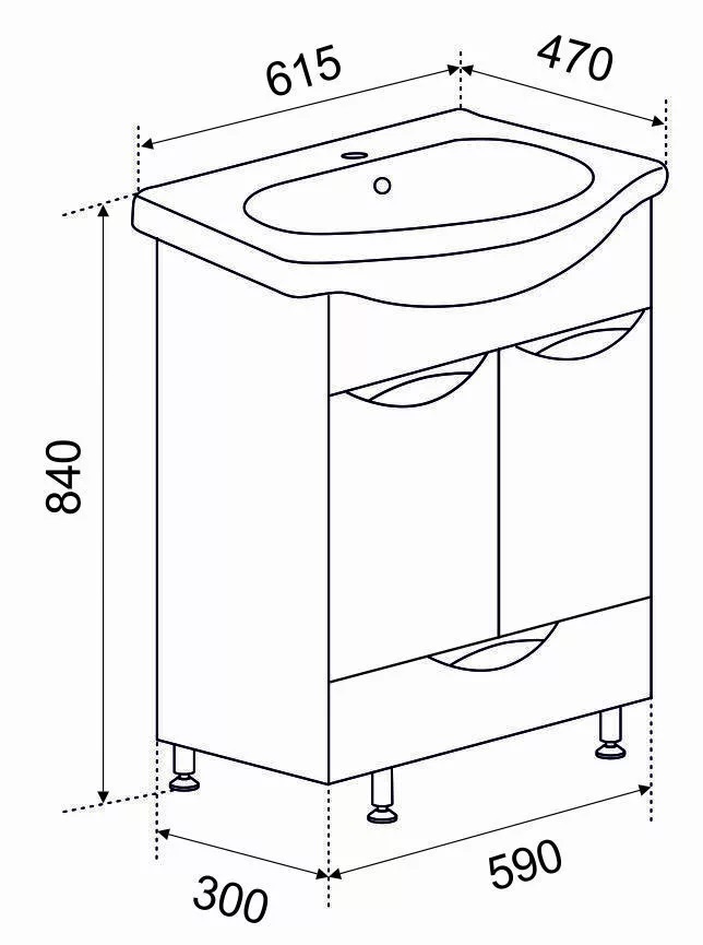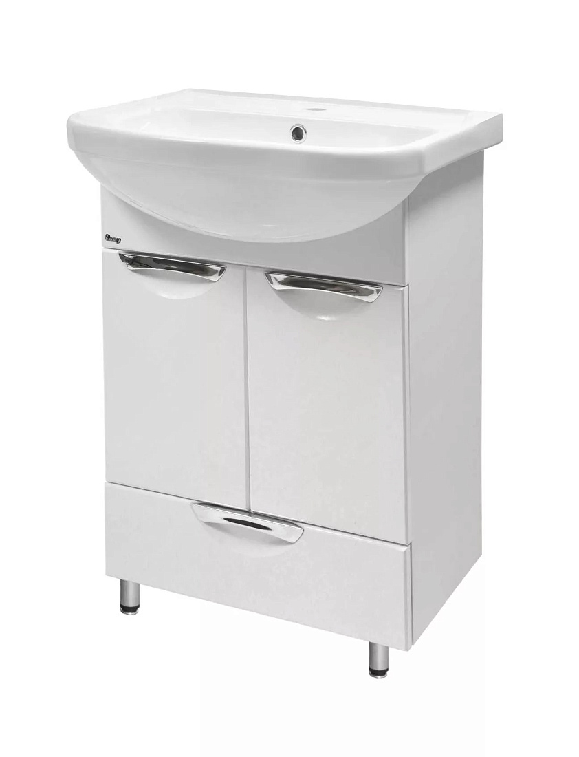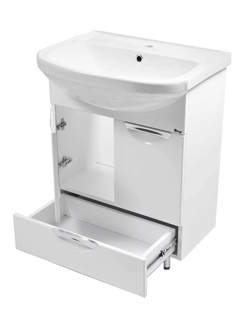 Тумба под умывальник двухдверная с 1 ящиком. Корпус выполнен из белого ЛДСП, фасад МДФ с пленкой ПВХ. Петли с доводчикамии, шариковые направляющие. Внутри тумбы 1 полка из ЛДСП. Поставляется в собраном виде.