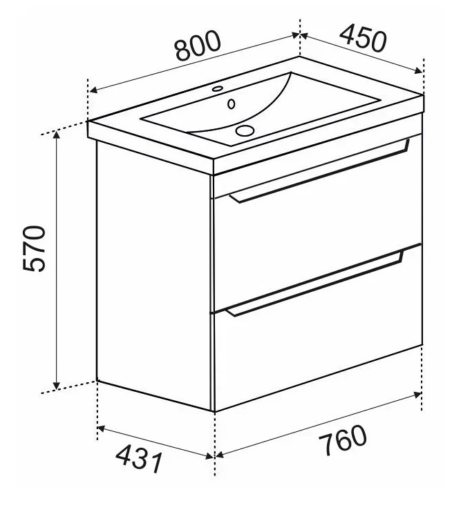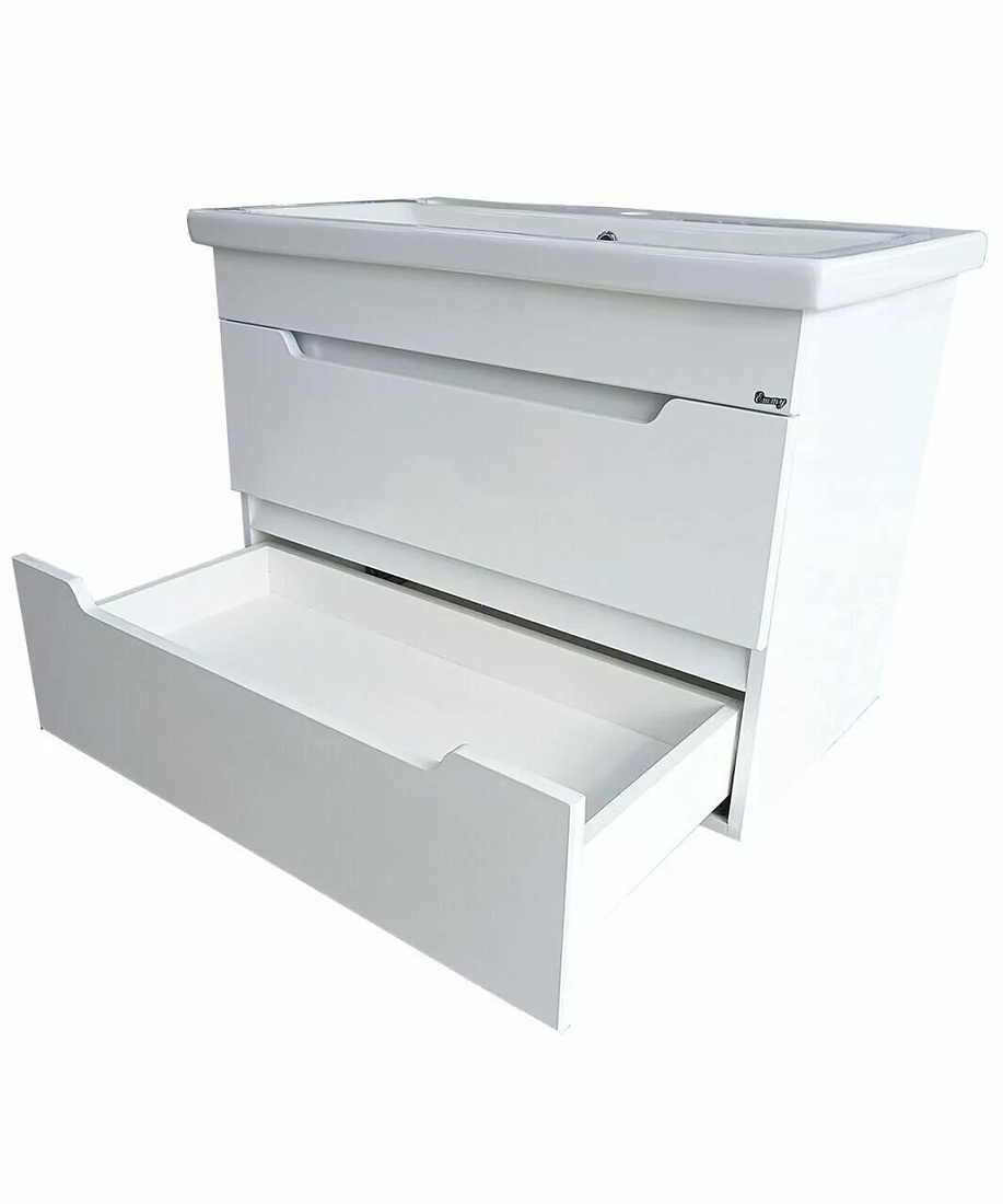 Тумба подвесная с умывальником с 2 ящиками. Корпус и фасад выполнен из МДФ с пленкой ПВХ. Направляющие скрытого монтажа с доводчиками.