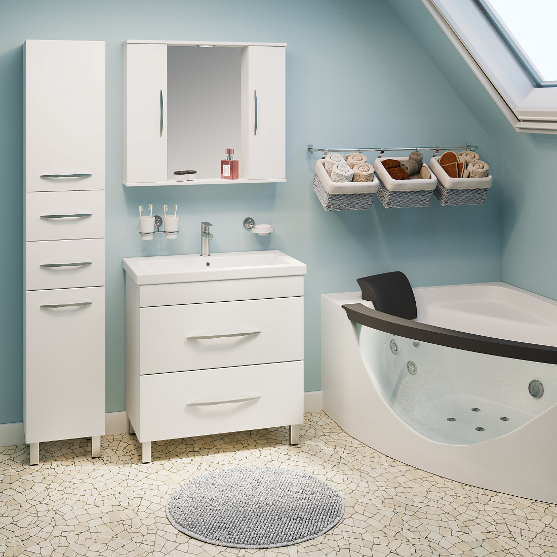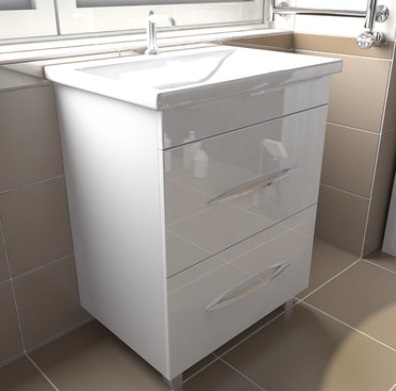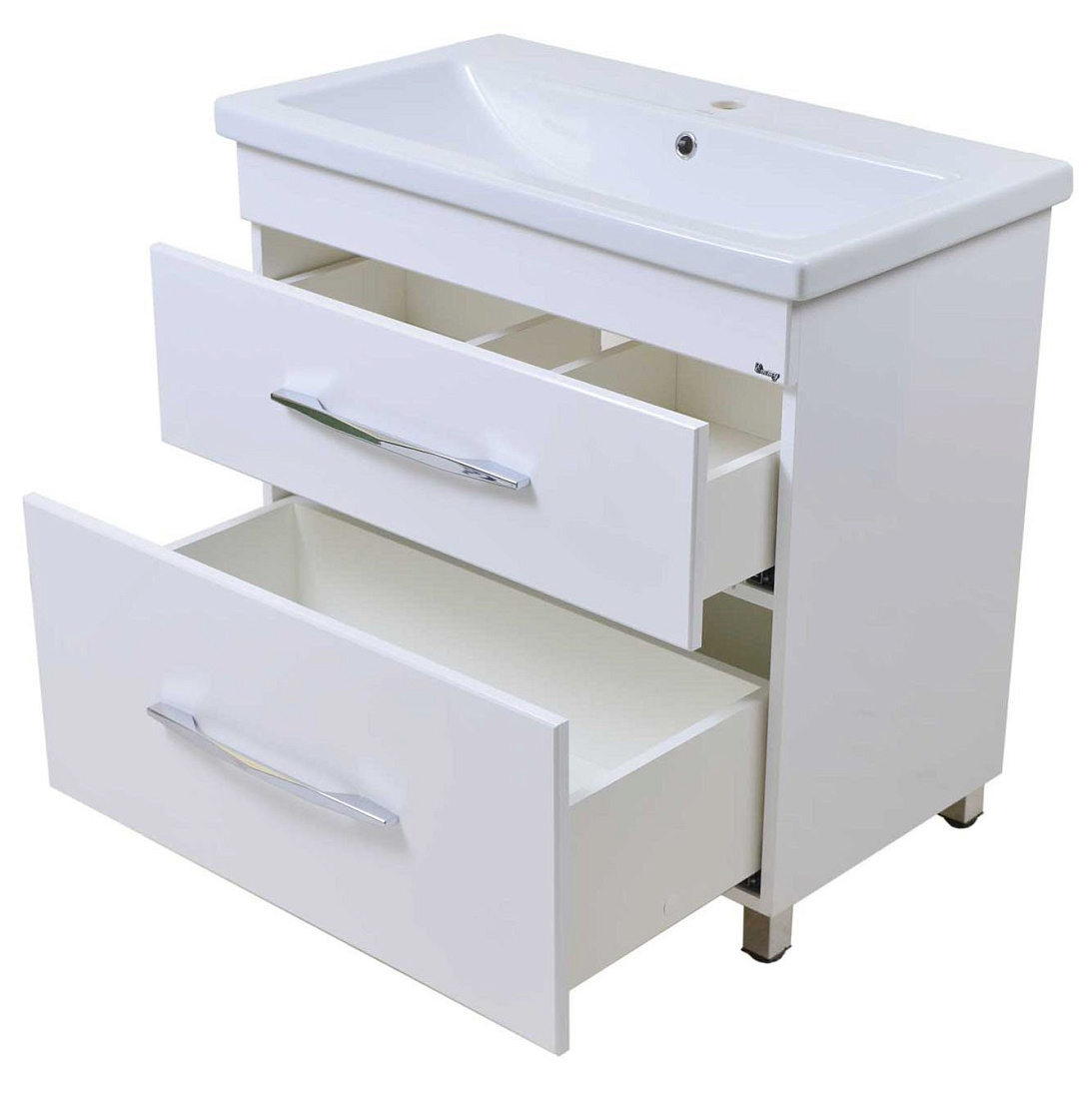 Тумба с умывальником с 2 ящиками. Корпус и фасад выполнен из МДФ с пленкой ПВХ. Направляющие скрытого монтажа с доводчиками. Поставляется в собраном виде.