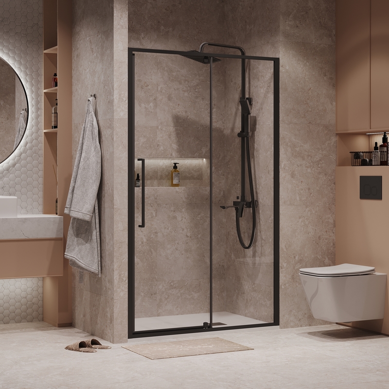 Дверь в нишу Niagara Nova NG-85-12AB (120х195) черный матовый,стекло прозрачное,дверь распашная,1 место купить по низкой цене в интернет-магазине «ГЕБОСАН»