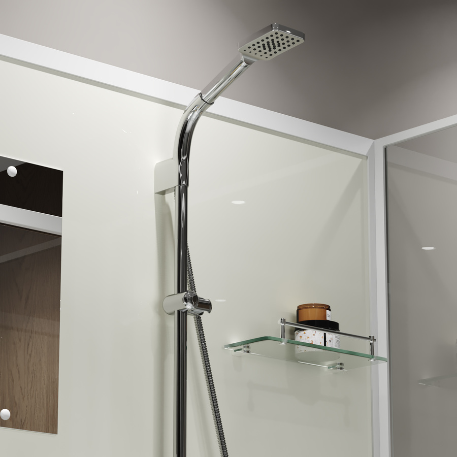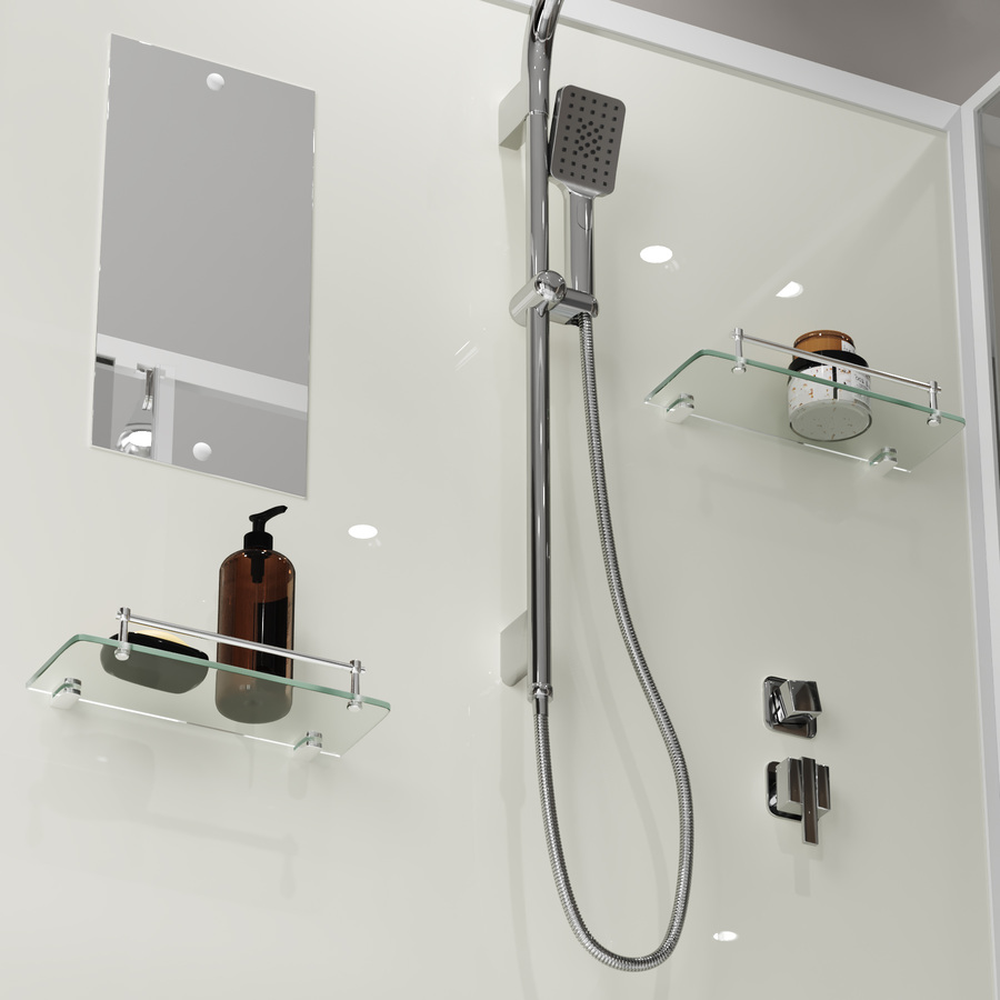 Для ванных принадлежностей есть полочка, которая пригодится для приема комфортного душа.