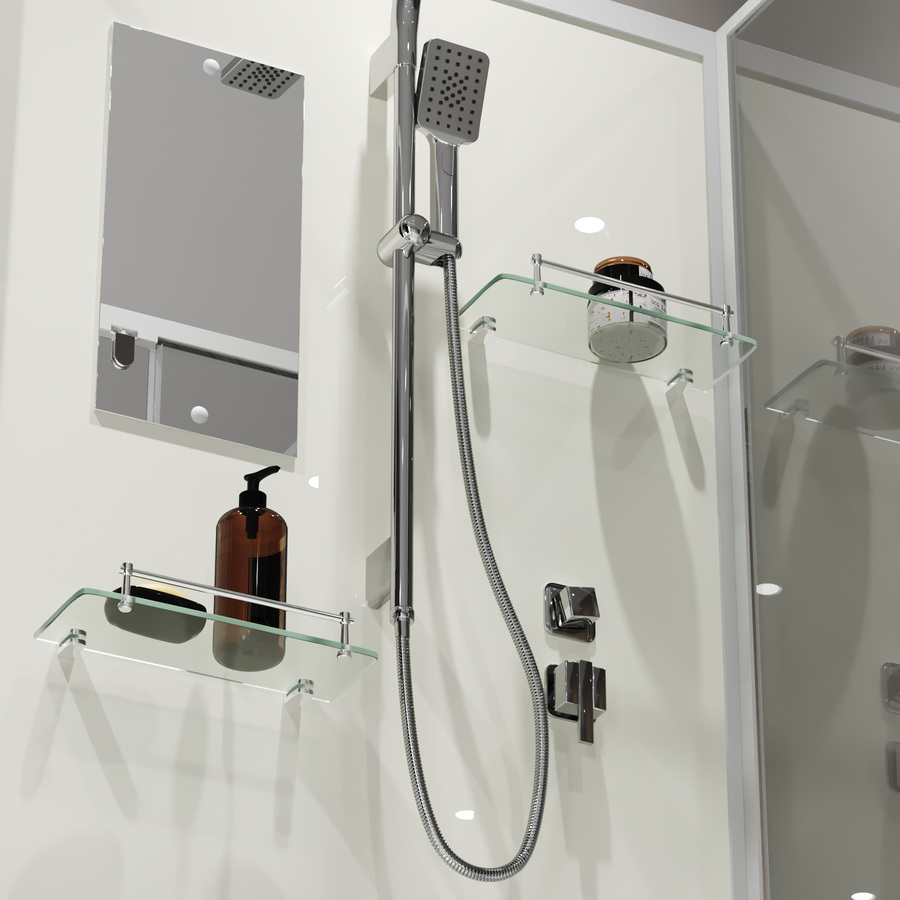 Для ванных принадлежностей есть полочка, которая пригодится для приема комфортного душа.