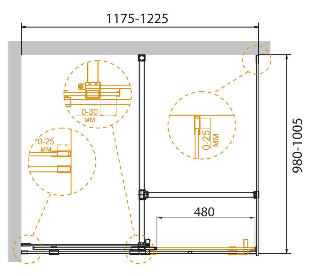 Поддон: тип АН, А или барьер. Поддон или барьер приобретается отдельно. Особенности: безпрофильное ограждение, нижние ролики, позаботятся о плавной и бесшумной фиксации двери..