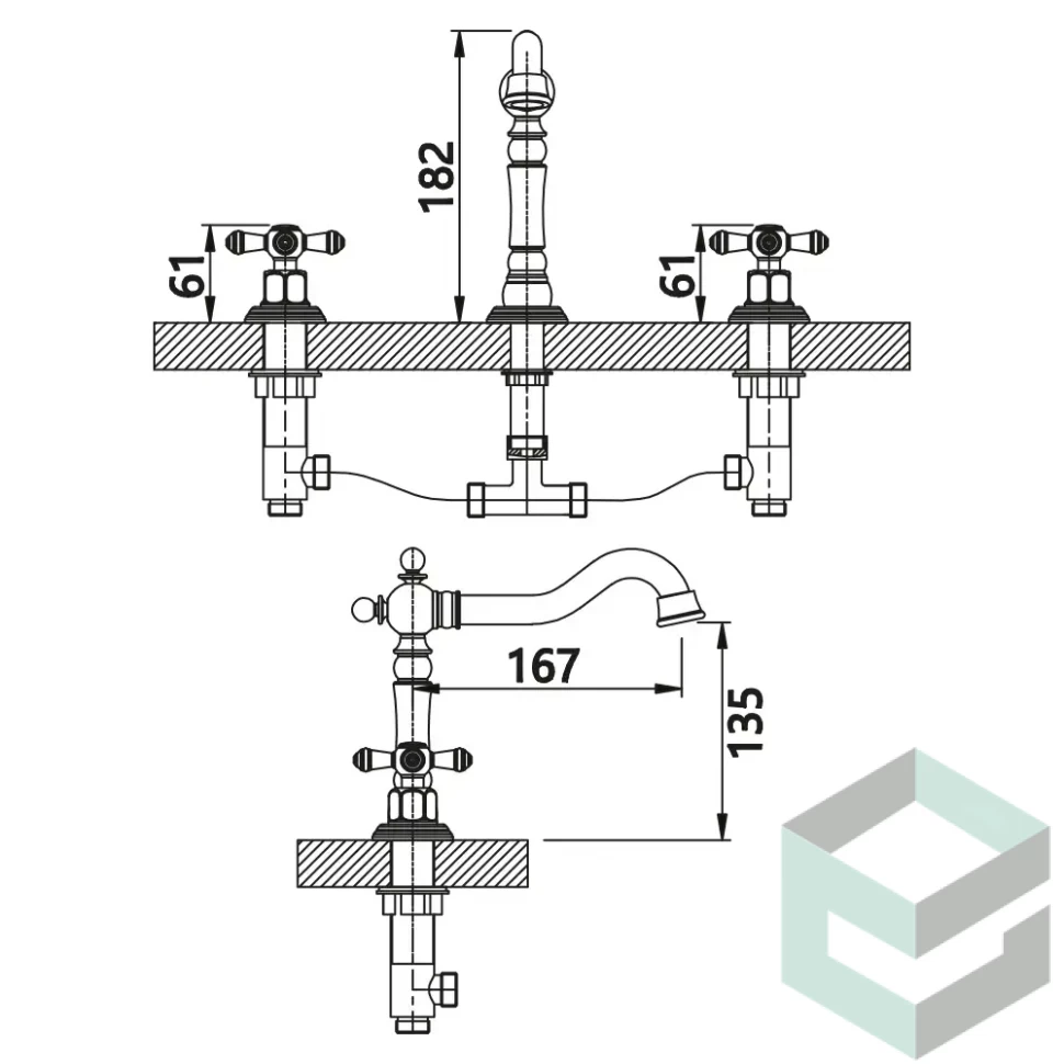 Описание: Смеситель с двумя рукоятками для раковины, врезной на 3 отверстия, с длинным поворотным изливом
