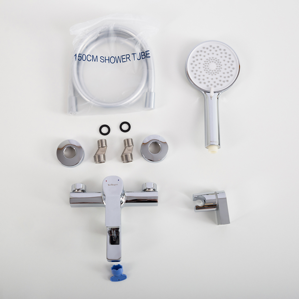 Оснащение: душевой шланг ПВХ, душевая лейка 3-х режимная из ABS, настенный держатель ручного душа, смеситель