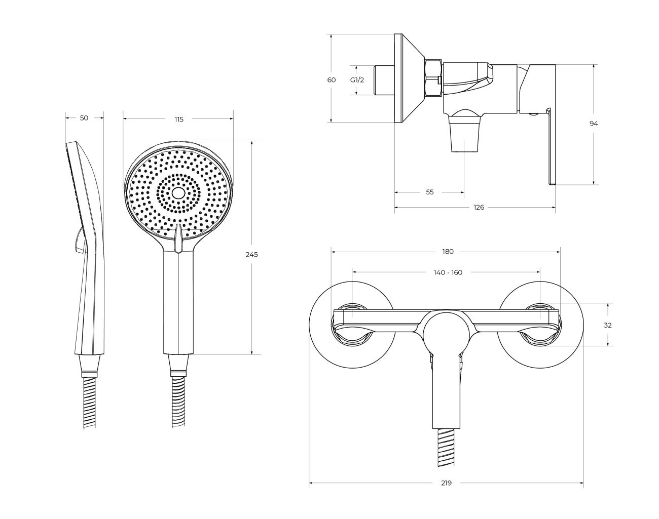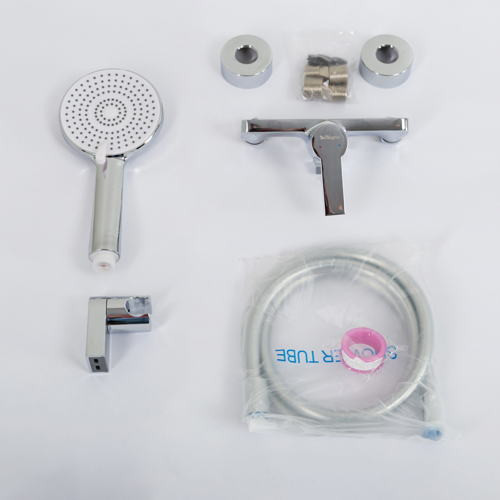 Оснащение: душевой шланг ПВХ, ручной душ 3-х режимный, настенный держатель ручного душа, смеситель