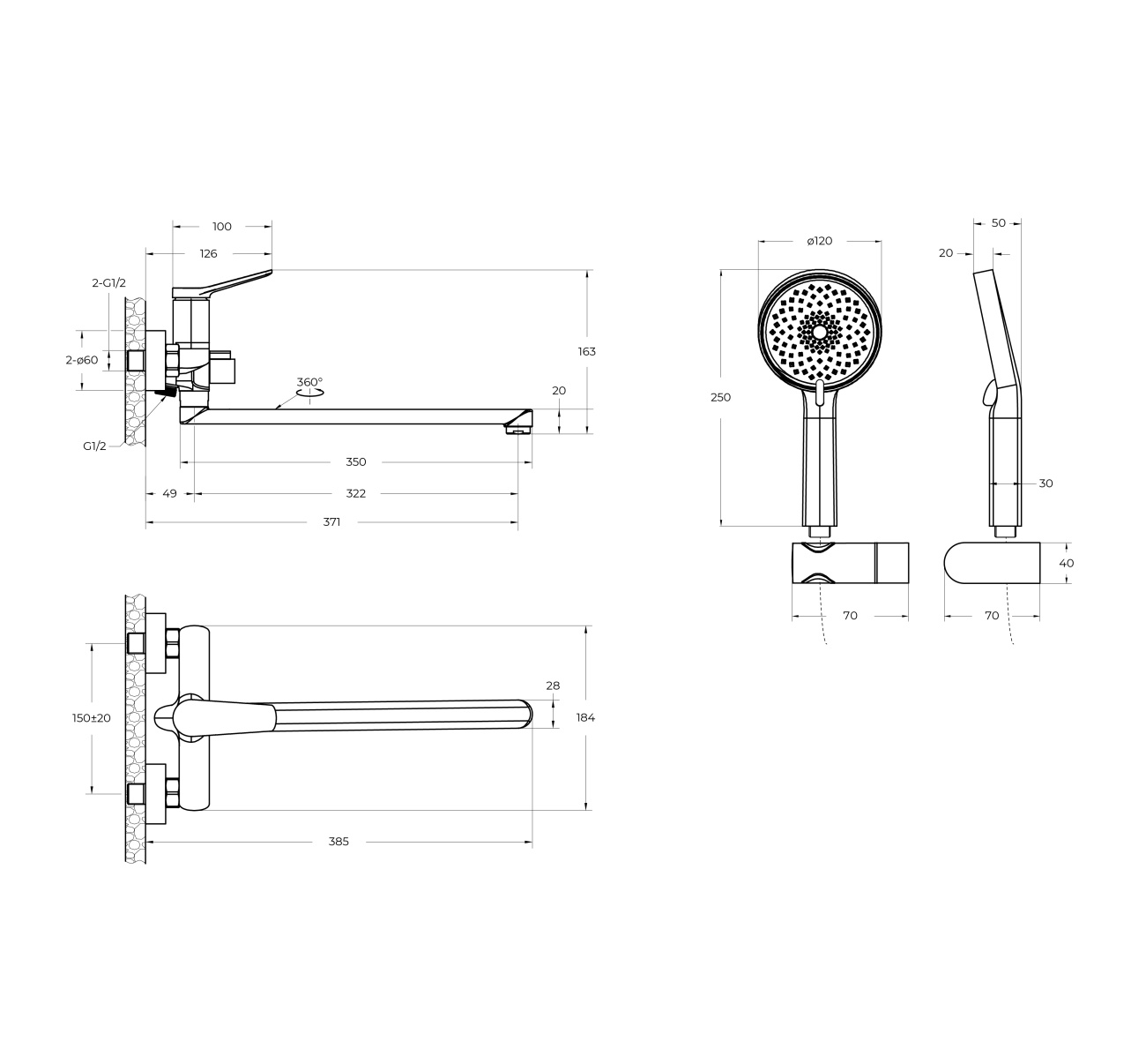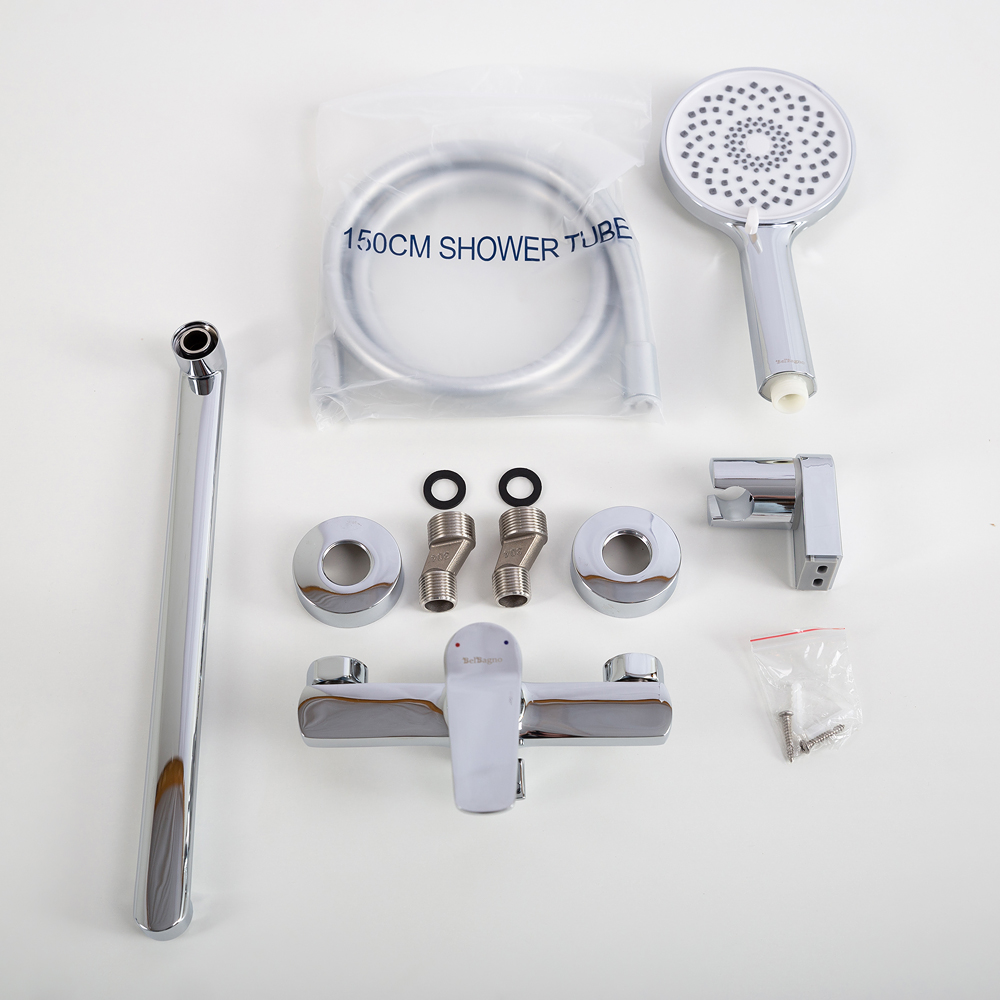 Оснащение: душевой шланг ПВХ, душевая лейка 3-х режимная из ABS, настенный держатель ручного душа, смеситель