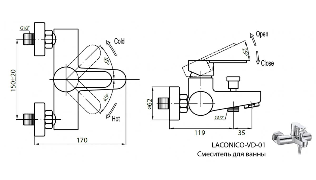 LACONICO-C-VD-01 Смеситель для ванны и душа, хром
