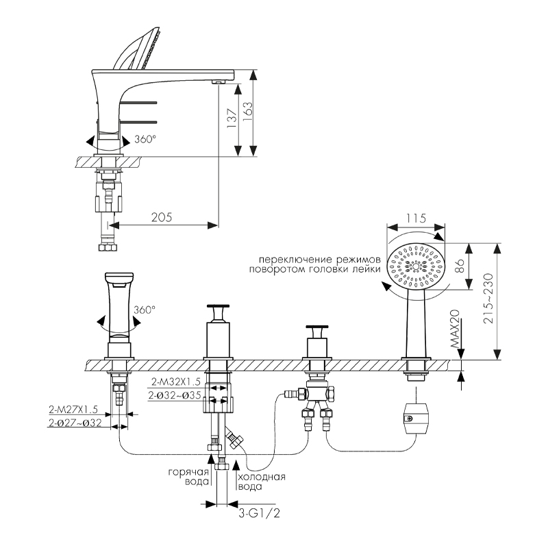 Смеситель для ванны Kaiser Star 02222 на 4 отверстия картридж Ф35, хром