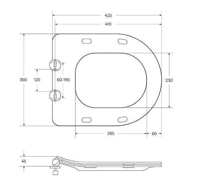 - Сиденье: тонкое, дюропласт, с функцией плавного закрывания, быстросъемное сиденье